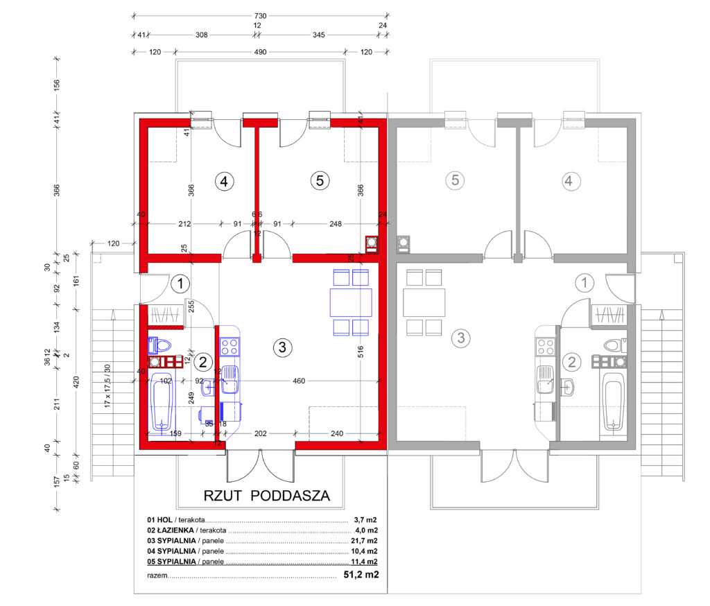 4 domy dwupiętrowe (całość 97,7 m²):