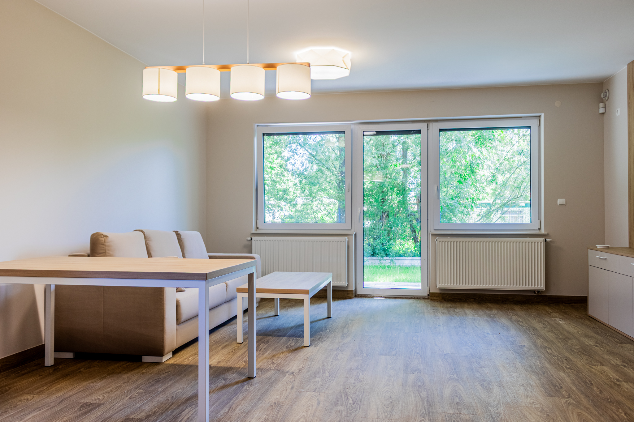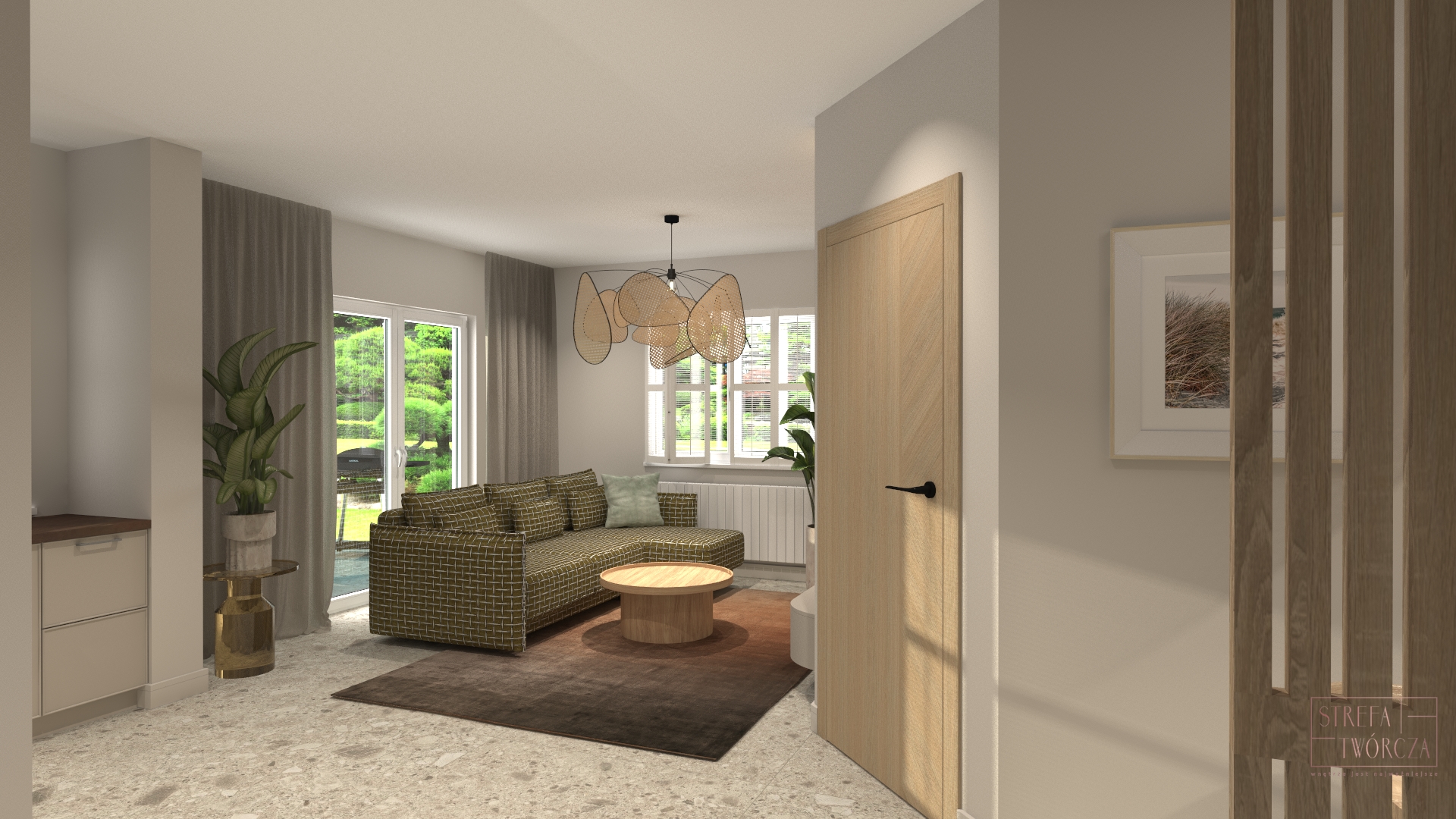 salon z dużymi przeszkleniami i bezpośrednim wyjściem na taras