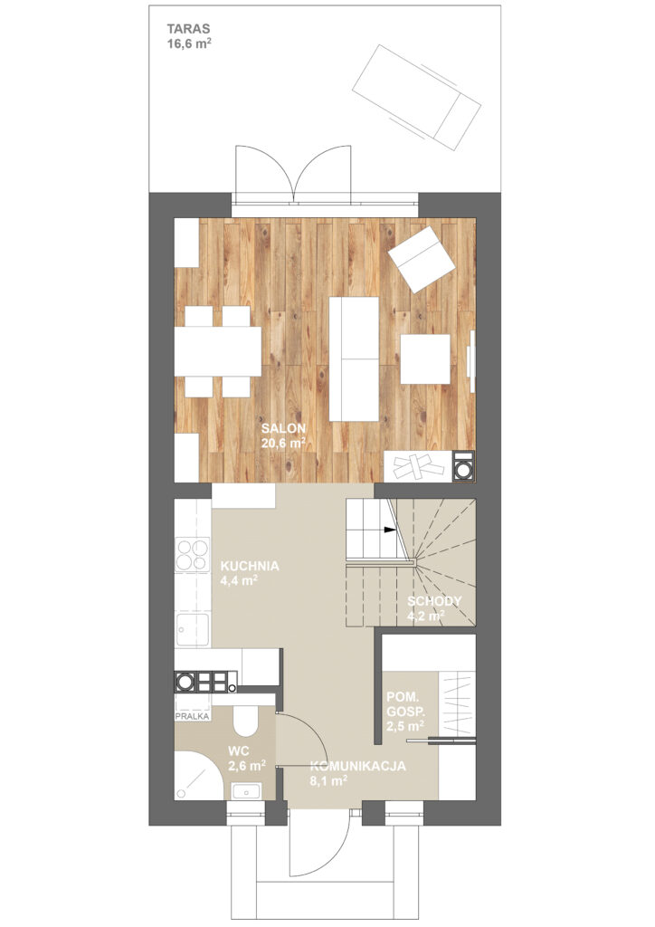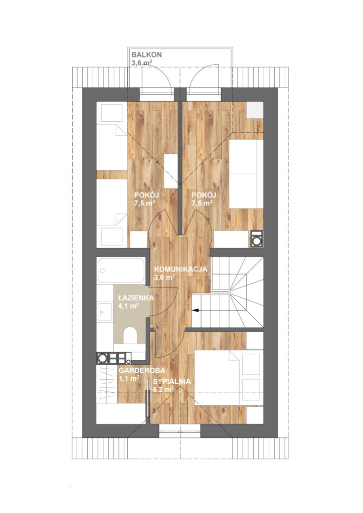 Zapewniają pełną prywatność i przestrzeń. Parter mieści otwartą strefę dzienną z salonem i kuchnią, pomieszczenie gospodarcze, sypialnię oraz toaletę. Na piętrze zaprojektowano 3 sypialnie i łazienkę.